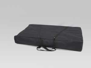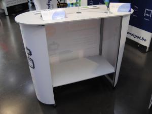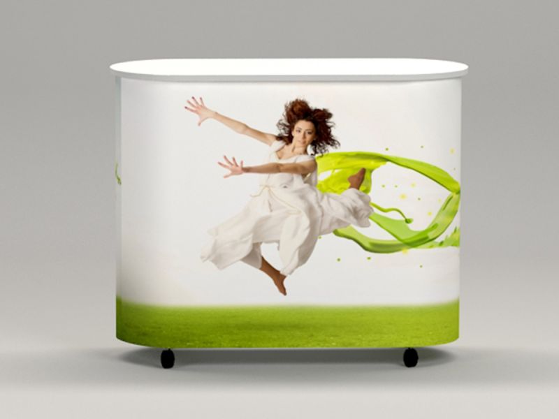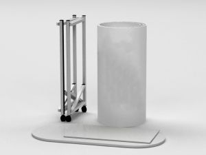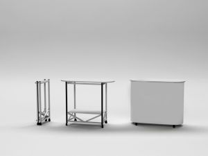 The print is a flexible PVC sheet, connected around the alu structure, with velcro 2 strips Strong structure in aluminium With wheels With shelve Comes with a transport bag