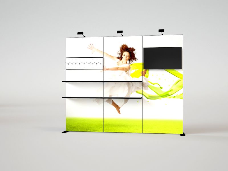 (W) 300 cm x (H) 250 cm 3 modules 3 prints or 1 print that covers the total structure with shelve, TV holder, LED spots, hangers